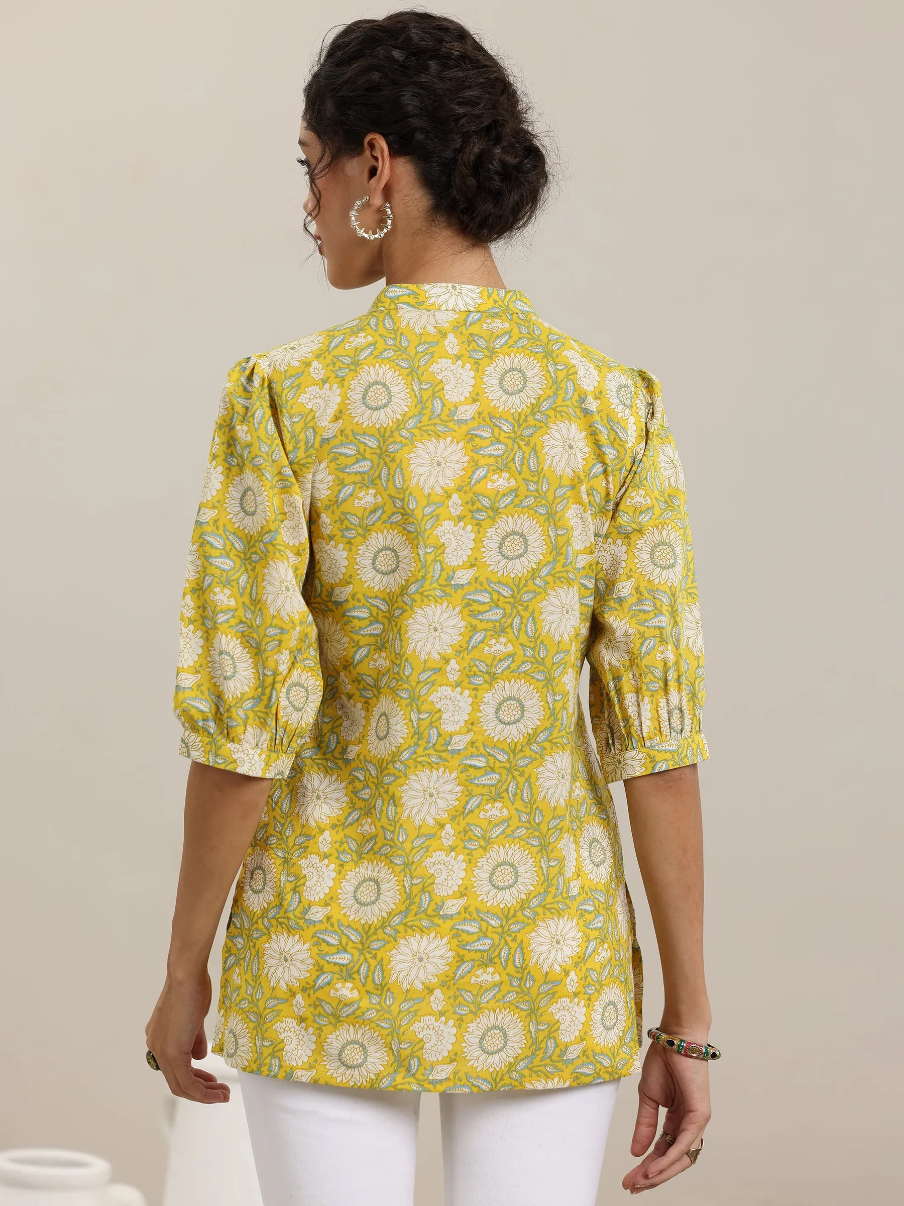 Yellow Printed Cotton Straight Short Kurti